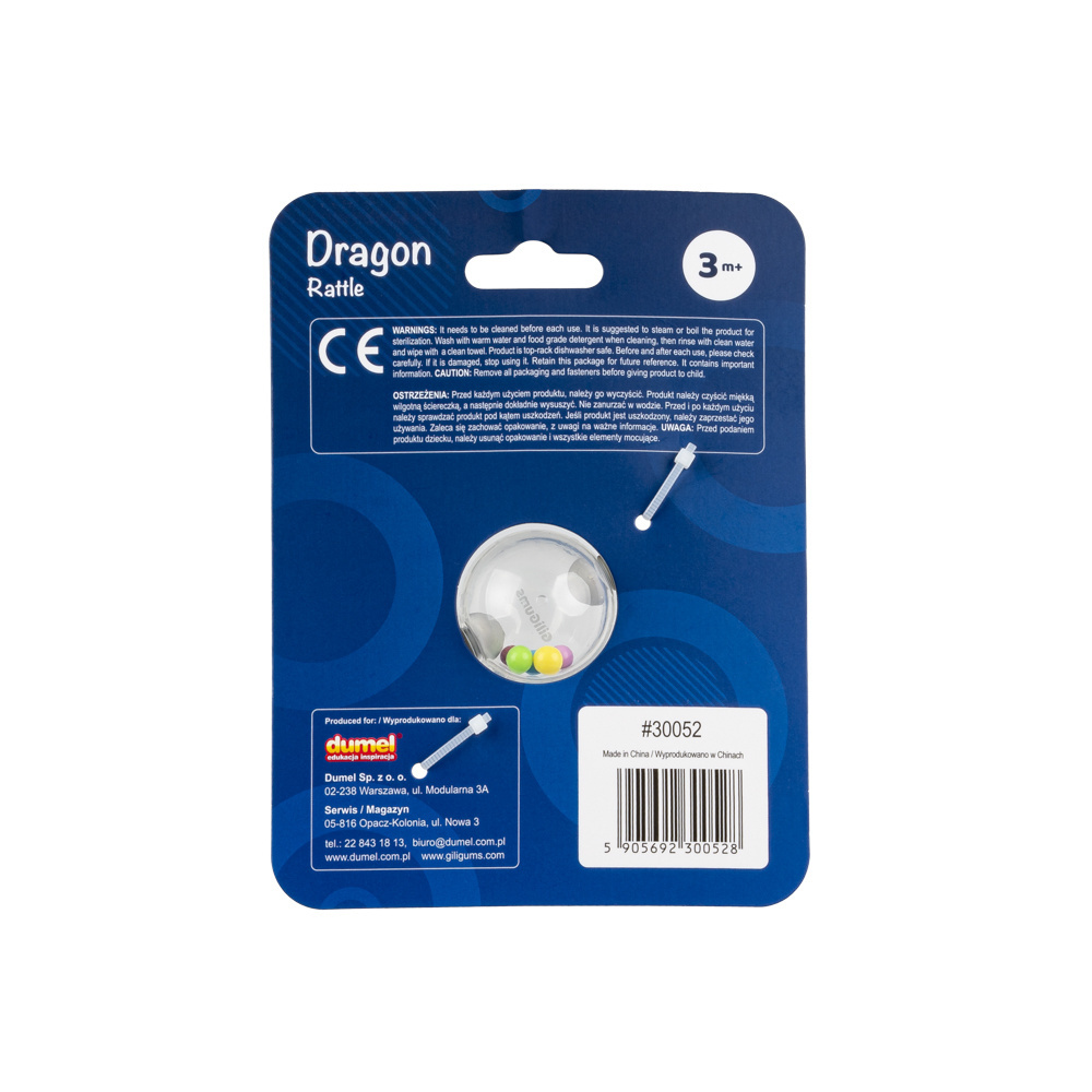 Dostosowany do małych rączek kształt zabawki, ułatwi maluchowi jej chwytanie. Wewnątrz smoka znajduje się kula wypełniona kolorowymi kuleczkami, które grzechoczą przy potrząsaniu.