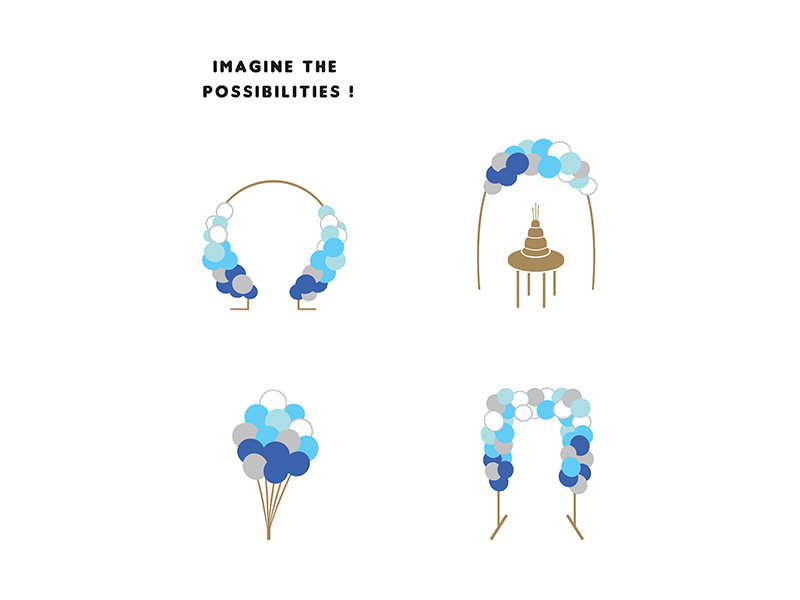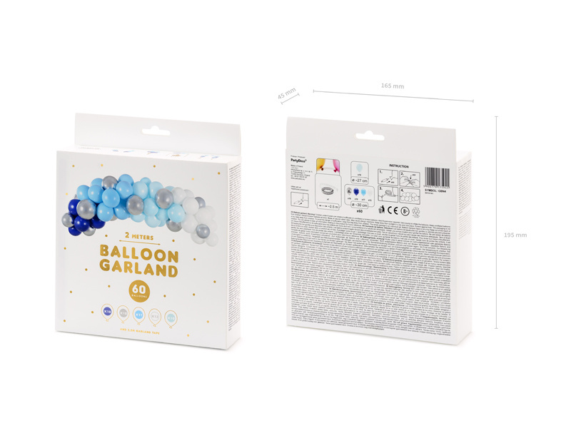 - Niebieska girlanda balonowa, zestaw zawiera 60 balonów (10 Glossy w kolorze srebrnym, 10 pastelowych w kolorze granatowym, 10 pastelowych w kolorze Light Blue, 17 pastelowych w kolorze błękitnym i 13 pastelowych w kolorze białym) i ok. 2.5 m taśmy do gir