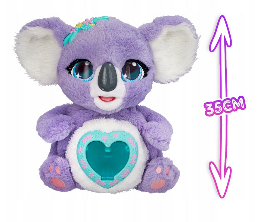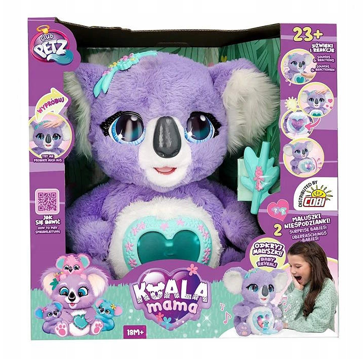 Koala reaguje na dotyk, wystarczy ją pogłaskać po głowie lub „nakarmić” liściem eukaliptusa (albo nacisnąć delikatnie jej języczek), by rozpoczęła się interaktywna zabawa prowadząca do narodzin małych koali. Z mamą koalą każda chwila to pełna czułości, kolorów i dźwięków przygoda!