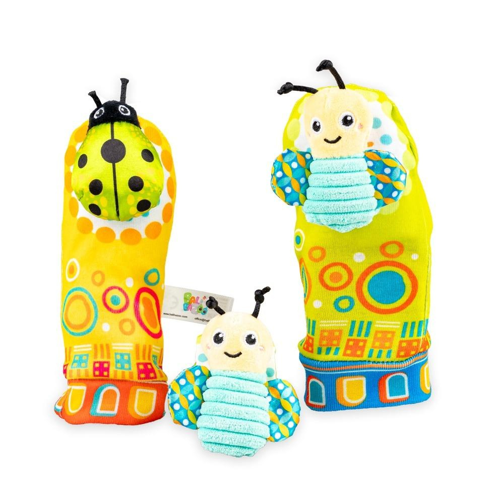 Zarówno skarpetki, jak i bransoletka ozdobione są grzechoczącym owadem, a skrzydełka motylków zabawnie szeleszczą, podczas dotykania.