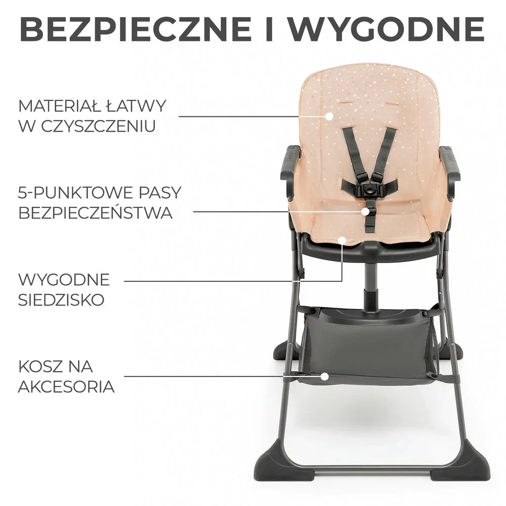 To stylowe, mobilne i łatwe w czyszczeniu krzesełko możesz złożyć już jednym ruchem.Ma kompaktowe wymiary, które ułatwiają przechowywanie krzesełka w domu. To krzesełko do karmienia, zaprojektowane do wygodnego spożywania posiłków.