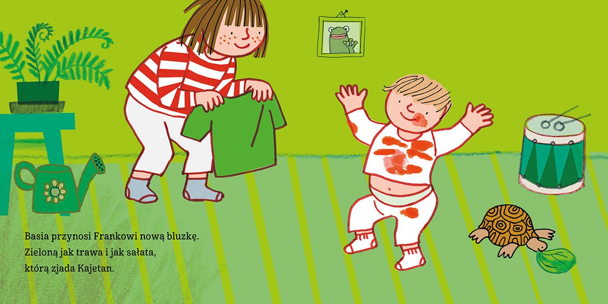 Franek ma na sobie czyste, białe ubranie, którego kolor przywodzi na myśl śnieg. Zazdrości Basi pasków na ubraniu, więc postanawia domalować je samodzielnie za pomocą czerwonych pomidorów. Poplamiona bluzka zostaje zmieniona czystą, zieloną jak trawa. Czy to już koniec przebieranek?