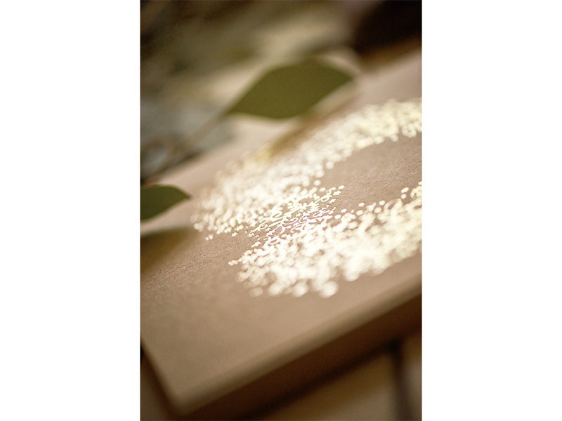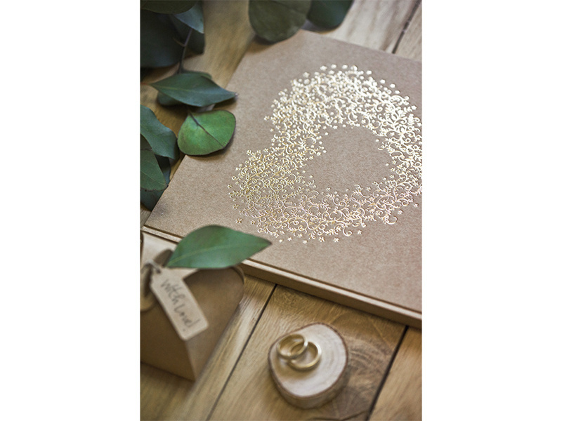 • Księga Gości oprawiona papierem kraft, ze złotym wzorem, wymiary 20,5x20,5 centymetra, 22 kartki, bez tekstu.