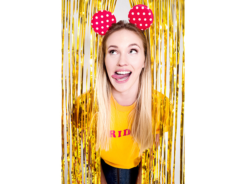 • Kurtyna Party w kolorze złotym, szerokość około 90 centymetrów, wysokość około 250 centymetrów.