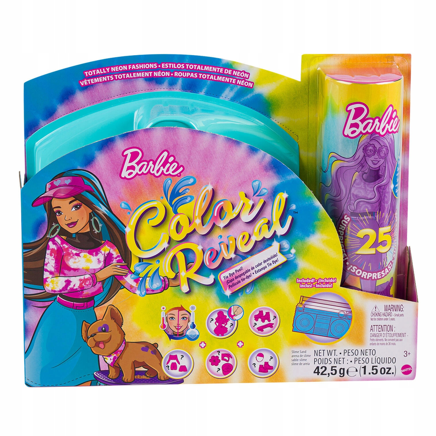 - Odkryj niespodzianki lalki Mattel Barbie Color Reveal w wersji Totally Neon Fashion Tie Dye.
