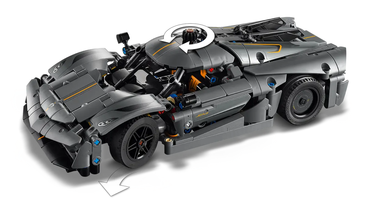 Podczas budowania ruchomego silnika V8 i mechanizmu różnicowego młodzi konstruktorzy mogą zgłębiać tajniki inżynierii. Następnie mogą sprawdzić działanie układu kierowniczego za pomocą odczepianego pokrętła mieszczącego się z przodu samochodu. Fajną funkcją tego zabawkowego pojazdu jest także dwuścienny system drzwi synchro-helix, które obracają się o 90 stopni i odchylają się na zewnątrz, zupełnie jak w prawdziwym hipersamochodzie.