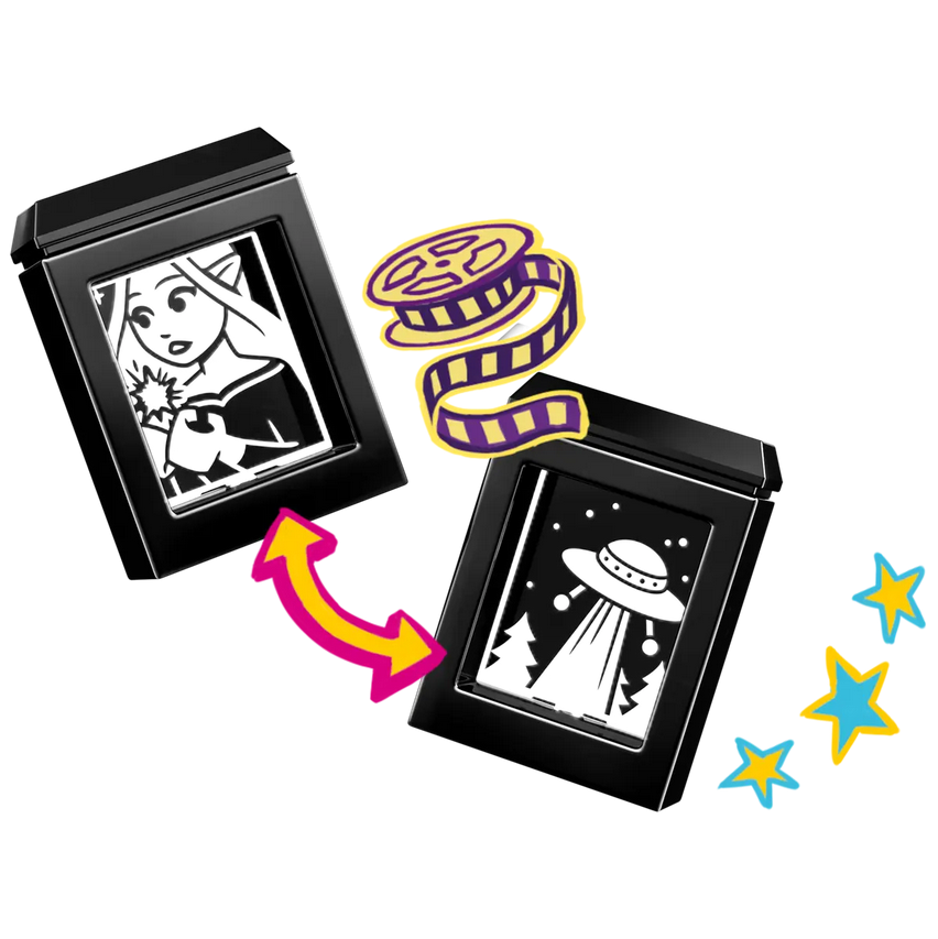 „Światła, kamera, przyjaźń!” - dzieci mogą teraz opowiedzieć historię Paisley i Aliyi, które organizują maraton filmowy w ogrodzie Paisley. Włóż slajd filmowy do projektora i naciśnij świecący klocek, aby wyświetlić obraz na dużym ekranie.