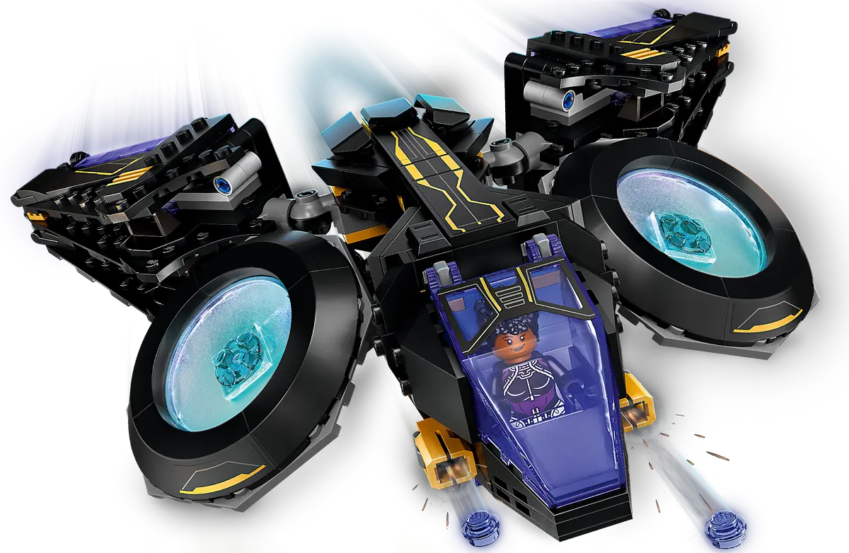 Za pomocą zawiasów skrzydła można składać do przodu lub do tyłu. Z tyłu statku jest schowek na broń Shuri, a z przodu zamontowane są dwa miotacze klocków. W zestawie są cztery minifigurki - Shuri, Ironheart MK 1, Nakia i Attuma - wszystkie wyposażone w ciekawą broń i akcesoria.