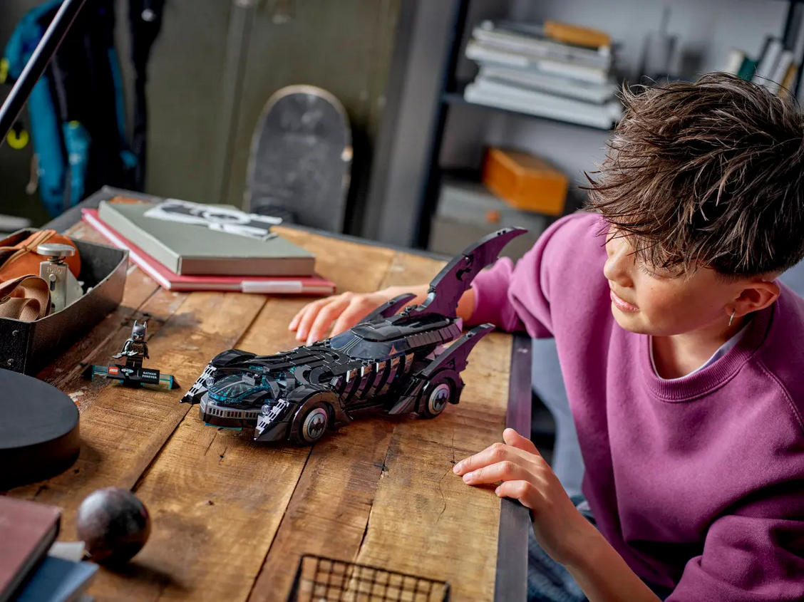 Ta realistyczna replika kultowego samochodu z filmu Batman Forever ma formowaną przednią szybę, ruchome koła, ozdoby i kokpit, który otwiera się, odsłaniając szczegółowe wnętrze. Zestaw zawiera również minifigurkę Batmana ze specjalną podstawką. Aby zapewnić dodatkową cyfrową zabawę, konstruktorzy mogą powiększać, obracać modele w 3D i śledzić swoje postępy za pomocą intuicyjnej aplikacji LEGO Builder.