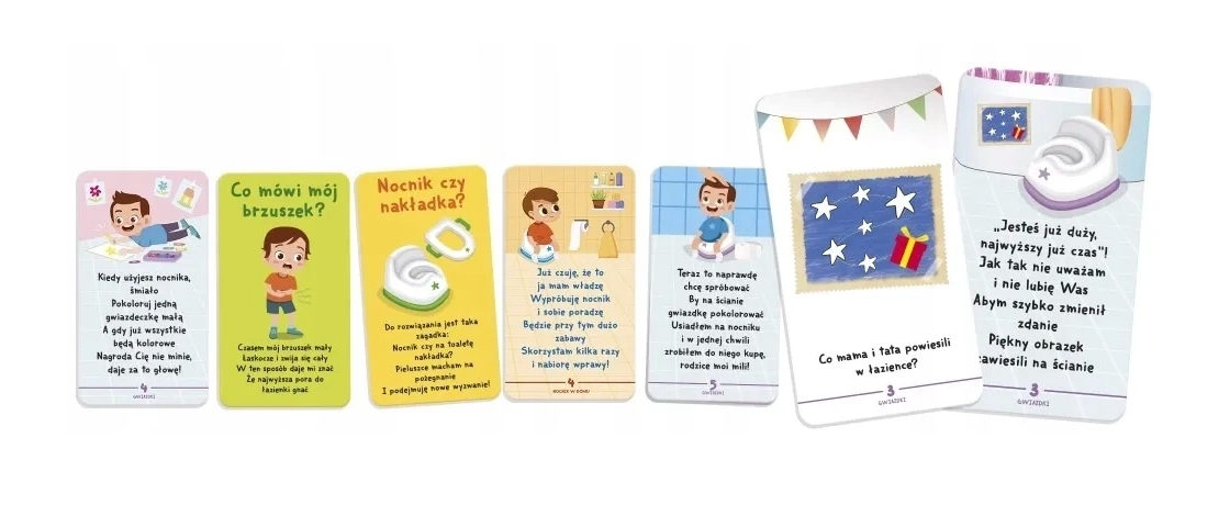 Za pomocą flashcards zgromadzonych w pudełku, które prezentują rady i różnego rodzaju czynności, rodzic nakłania dziecko do rozpoczęcia korzystania z toalety.