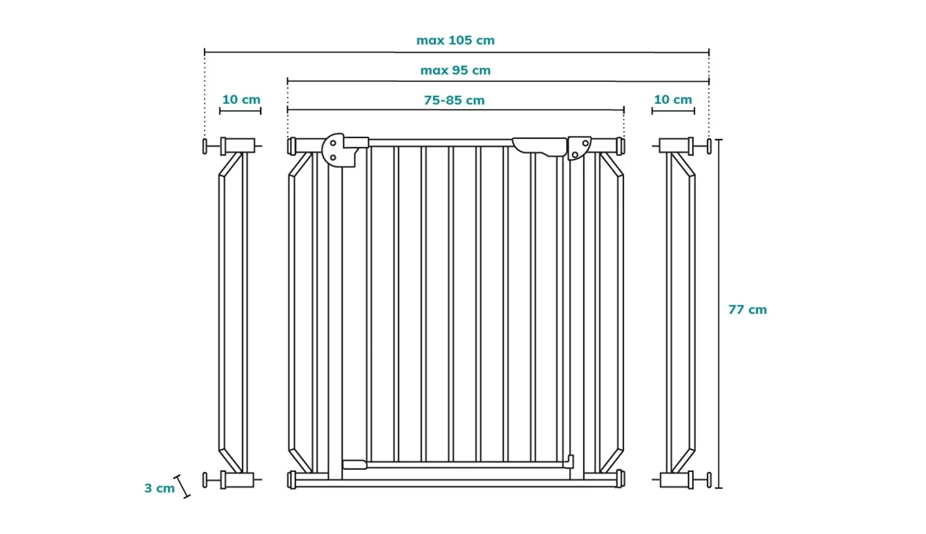 Niniejsza barierka przeznaczona jest wyłącznie do użytku domowego. Barierka bezpieczeństwa jest odpowiednia do użytkowania przez dzieci w wieku do 24 miesięcy. Szerokość otworowa, do których zaprojektowana jest barierka: 75 - 85 cm do 105 cm z przedłużkami.