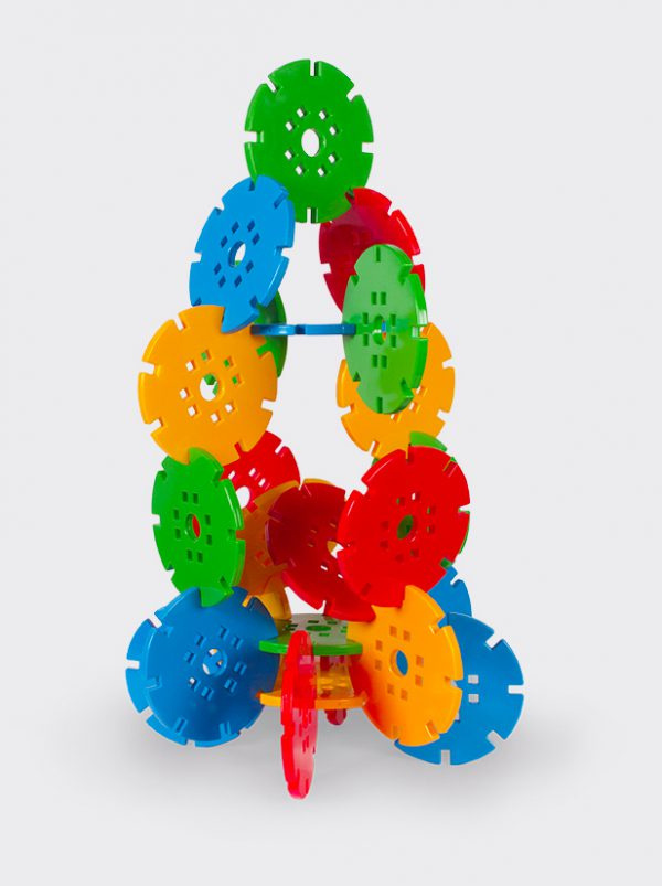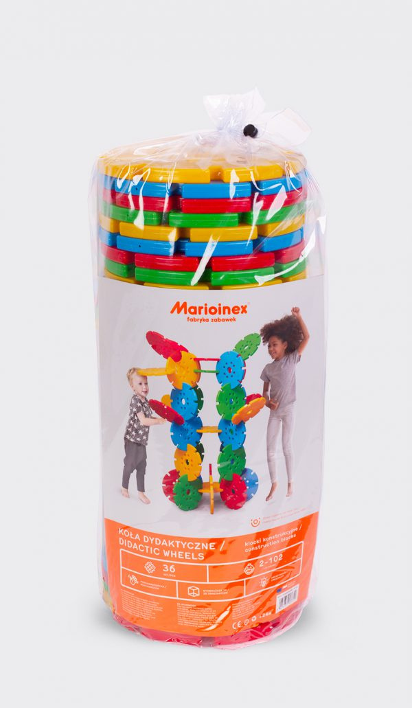 Z kół dydaktycznych można budować duże, przestrzenne konstrukcje, które dostarczają dzieciom bardzo dużo radości. A przy okazji usprawniają koordynację wzrokowo-ruchową i rozwijają procesy poznawcze. Wspomagają pamięć, umiejętności utrzymywania uwagi oraz kontroli.