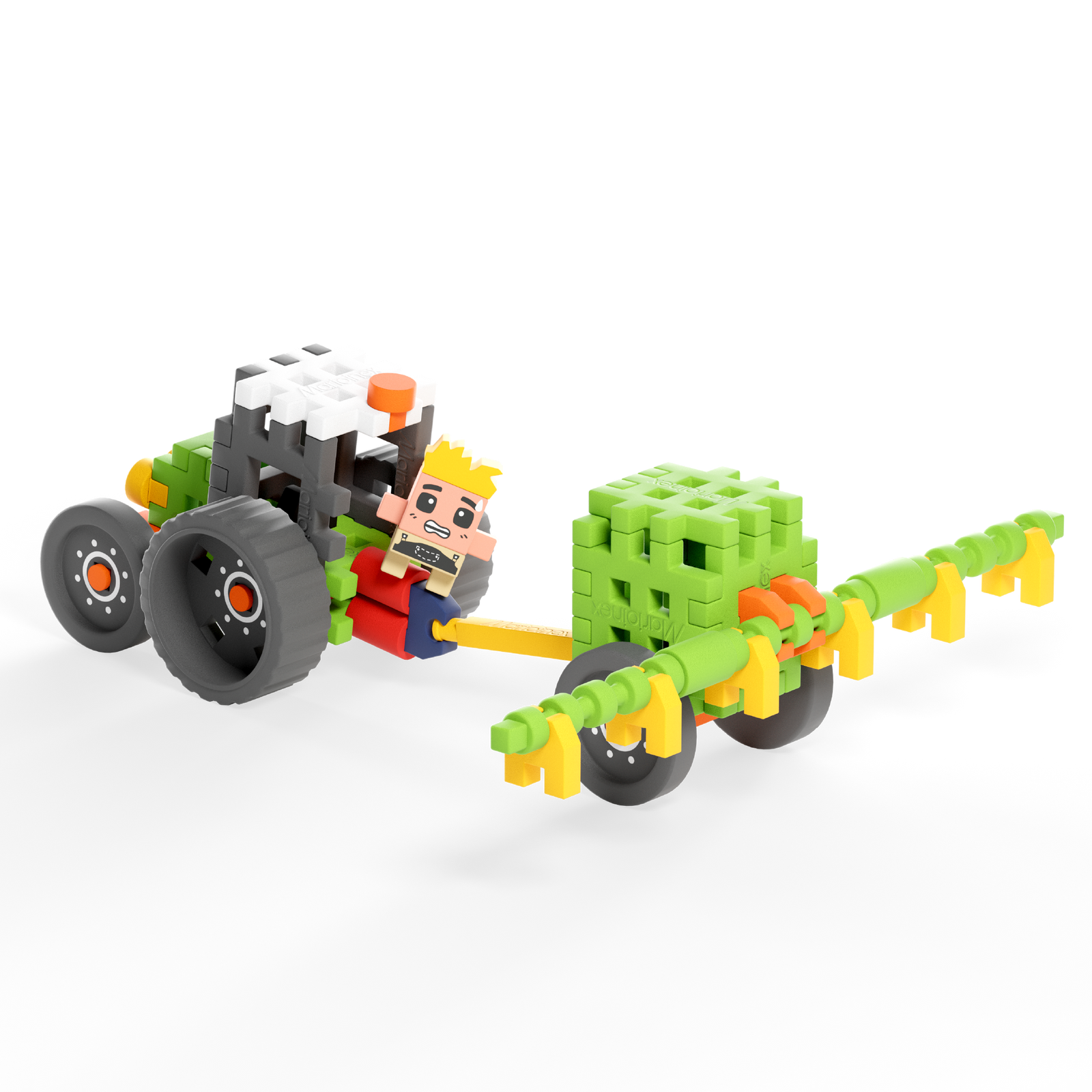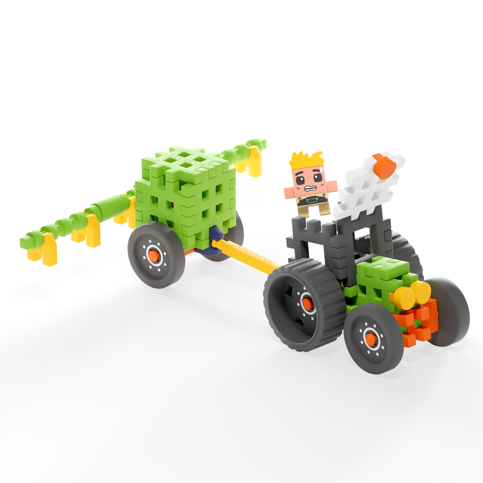 W zestawie znajduje się 50 elastycznych, kolorowych elementów, z których można zbudować realistyczny model traktora z opryskiwaczem oraz figurkę Andy’ego. Dzięki dużym kołom i specjalnej konstrukcji opryskiwacza zabawa nabiera realizmu i dynamiki.