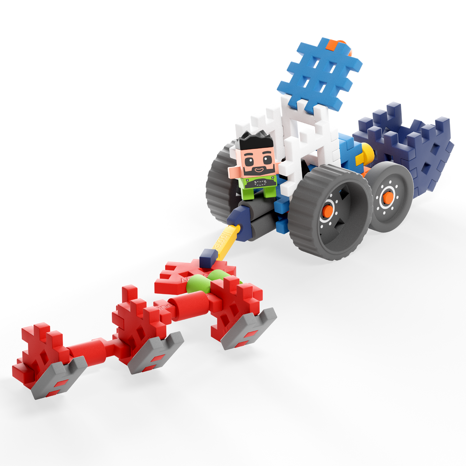 W zestawie znajduje się 50 elastycznych, kolorowych elementów, z których można stworzyć model traktora z pługiem oraz figurkę Jacka. Specjalna konstrukcja pługa pozwala na zabawę w stylu prawdziwego rolnika, a duże koła dodają pojazdowi charakteru.