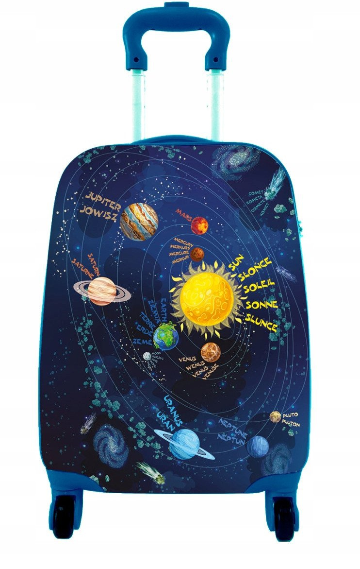 - Urocza, pojemna walizka na kółkach z motywem kosmosu, która z pewnością przypadnie do gustu każdemu małemu podróżnikowi.