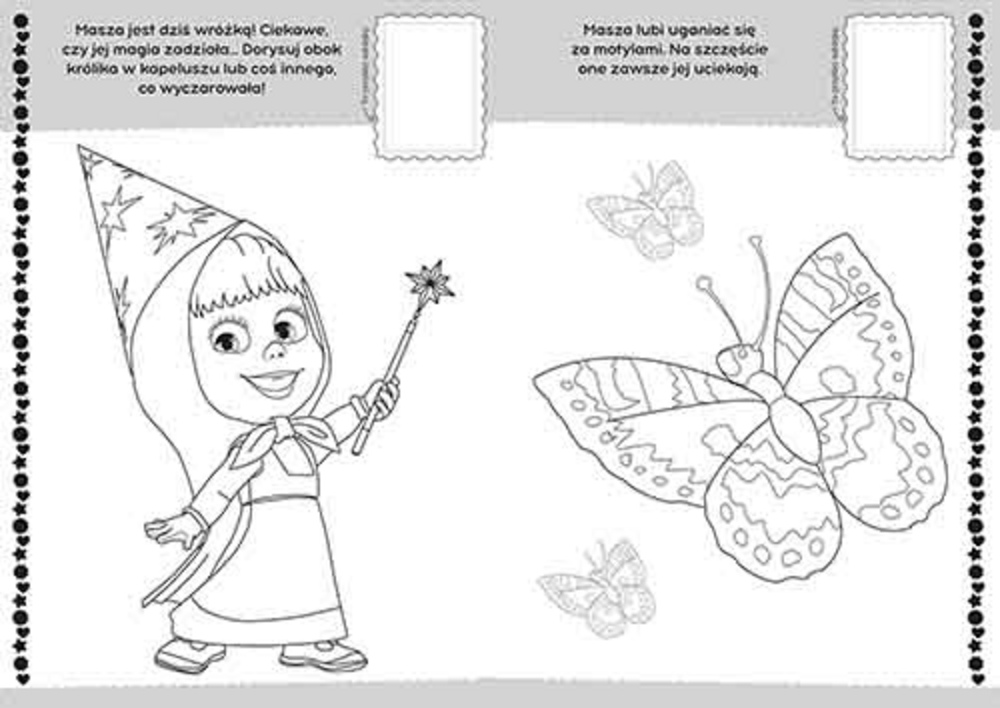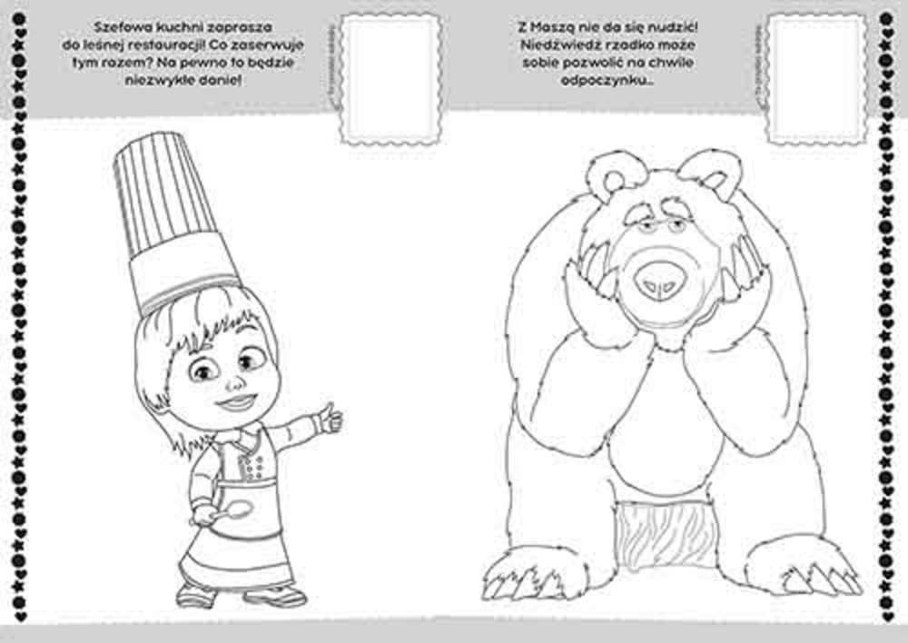 - Drugi w serii Koloruj i naklejaj tytuł z Maszą i Niedźwiedziem w rolach głównych! Ta prosta kolorowanka z naklejkami to propozycja dla maluszków, które zaczynają dopiero swą przygodę z kredkami i flamastrami.