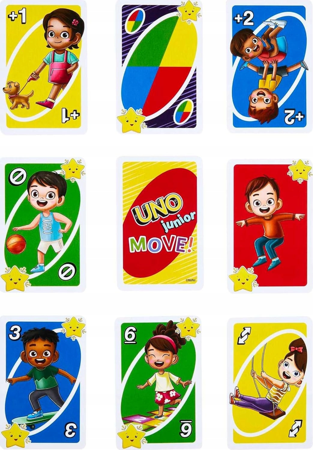 Gra karciana UNO Junior Move! jest podobna do klasycznego UNO Junior – gracze dopasowują kolory i liczby, ale specjalne karty Move! sprawiają, że po zagraniu karty z ikoną gwiazdki gracze muszą skakać, tańczyć, klaskać lub się pochylać.