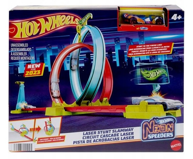 - Wskocz w podwójną odwróconą pętlę, a następnie ścigaj się przez linię mety na torze Hot Wheels Neon Speeders Laser Stunt Slamway.