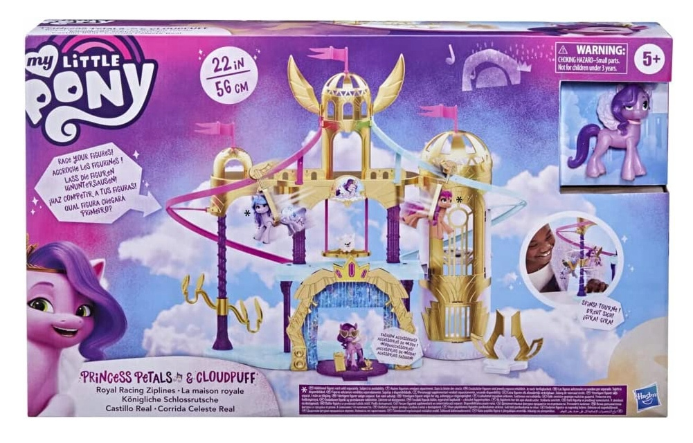 - Ten zestaw do zabawy z zamkiem dla dziewczynek i chłopców inspirowany jest pałacem Zephyr Heights z filmu My Little Pony: Nowe pokolenie i ma 56 centymetrów wysokości.