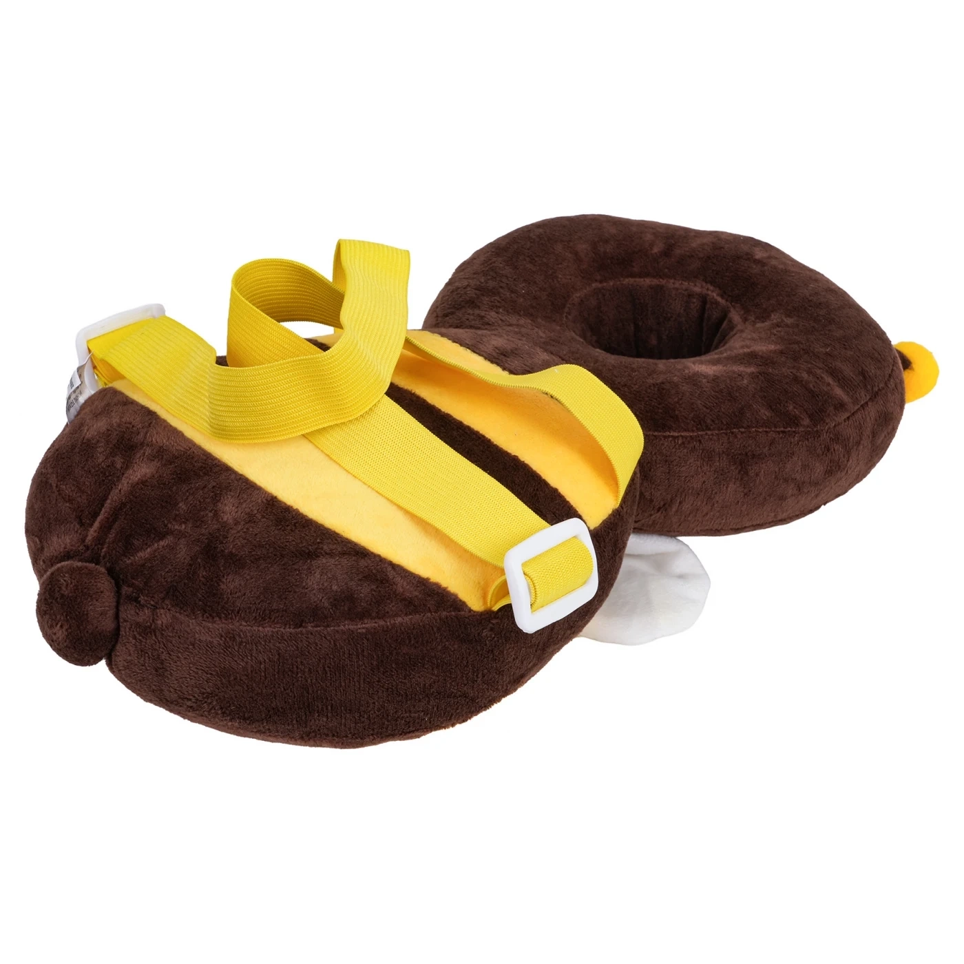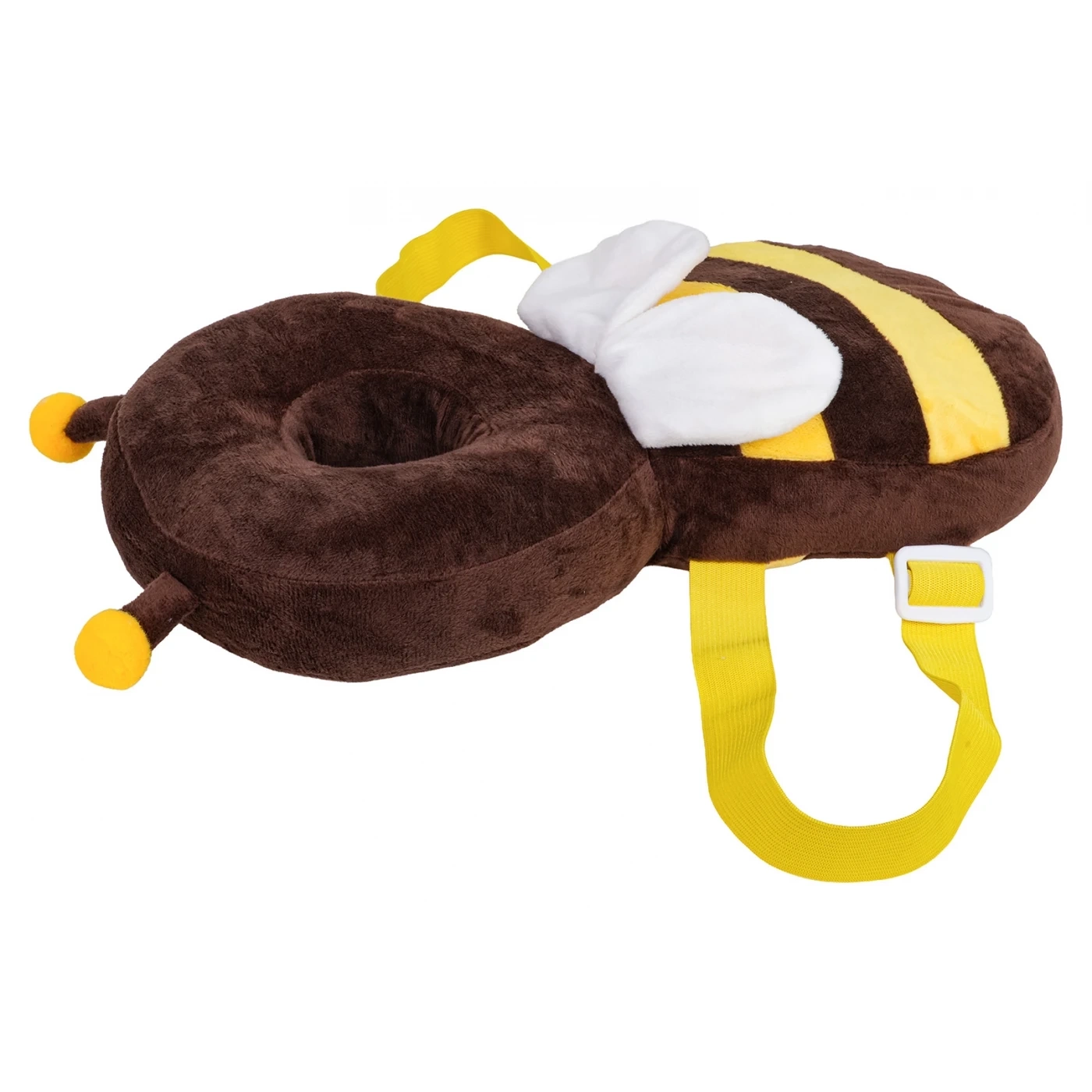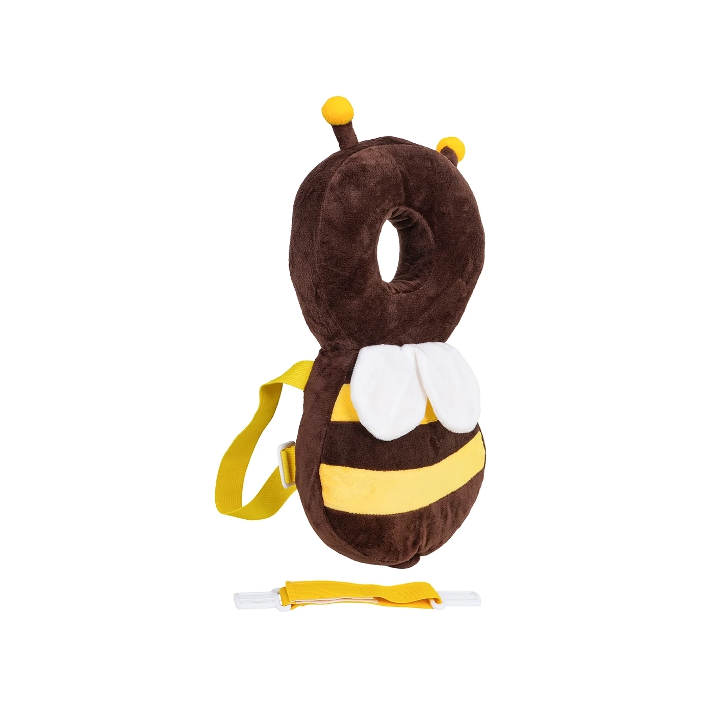 Ochraniacz został wykonany z delikatnego, przyjemnego w dotyku pluszu, który nie podrażnia skóry dziecka. Regulowane szelki umożliwiają dopasowanie ochraniacza do sylwetki malucha, dzięki czemu pozostaje on stabilnie na plecach podczas ruchu.