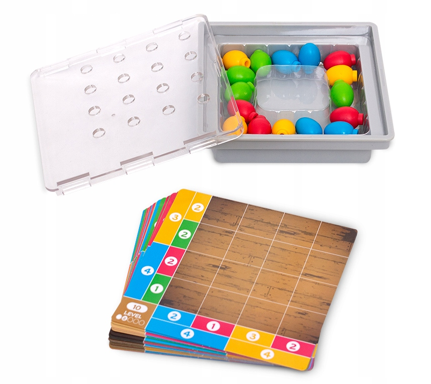 Karty zadań (jest ich aż 40) posiadają różne poziomy trudności. Niektóre zadania są trudniejsze, inne łatwiejsze. Po zabawie wszystkie akcesoria schowamy w pudełeczku. Gra rozwija inteligencję.