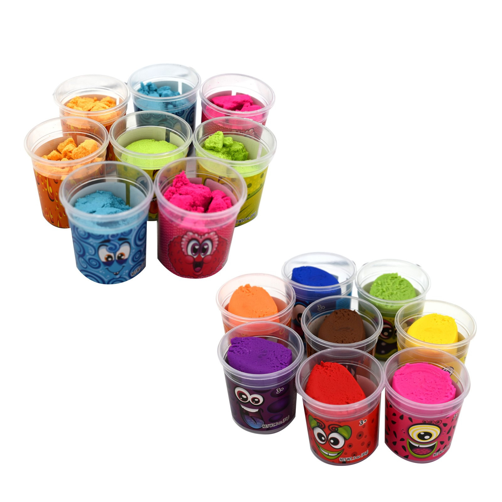 Ten duży zestaw tworzy osiem kubeczków z piaskiem kinetycznym w różnych kolorach, osiem kubeczków z ciastoliną w rożnych kolorach, a także trzy foremki do zabawy oraz narzędzie do formowania kształtów.