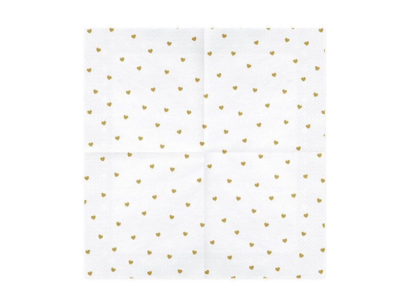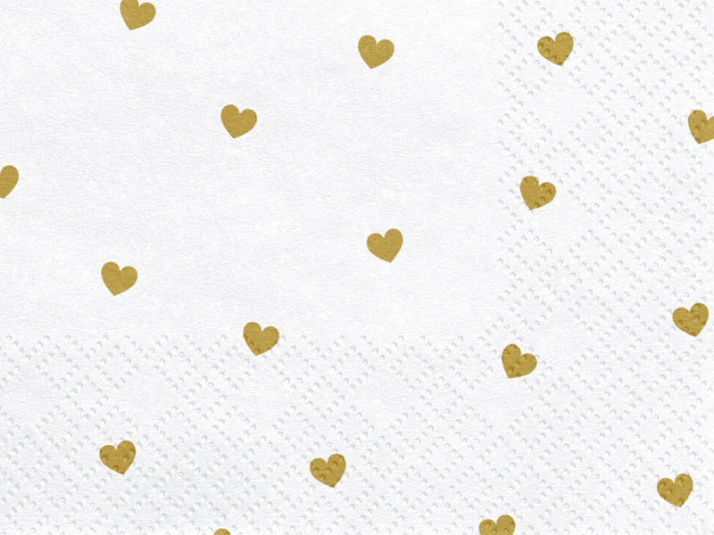 • Serwetki papierowe Serca w kolorze białym ze złotym nadrukiem, wymiary po rozłożeniu ok. 33 x 33 cm, wymiary po złożeniu ok. 16,5 x 16,5 cm. (1 op. / 20 szt.)