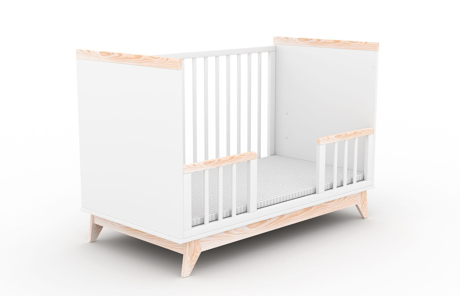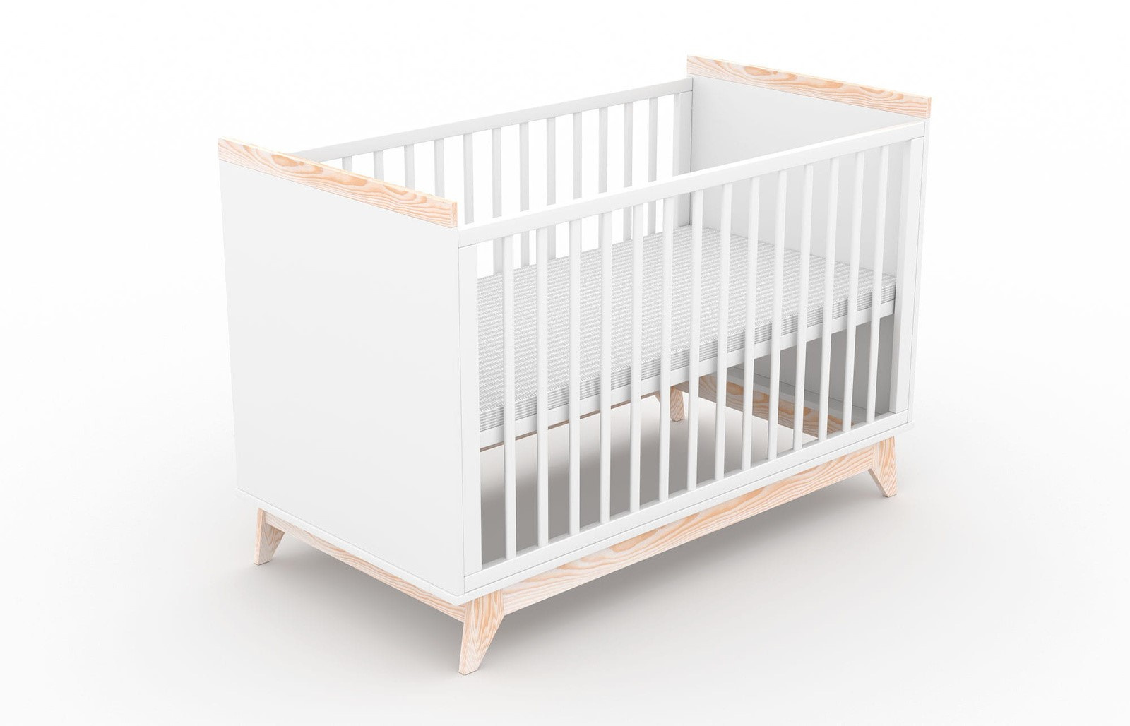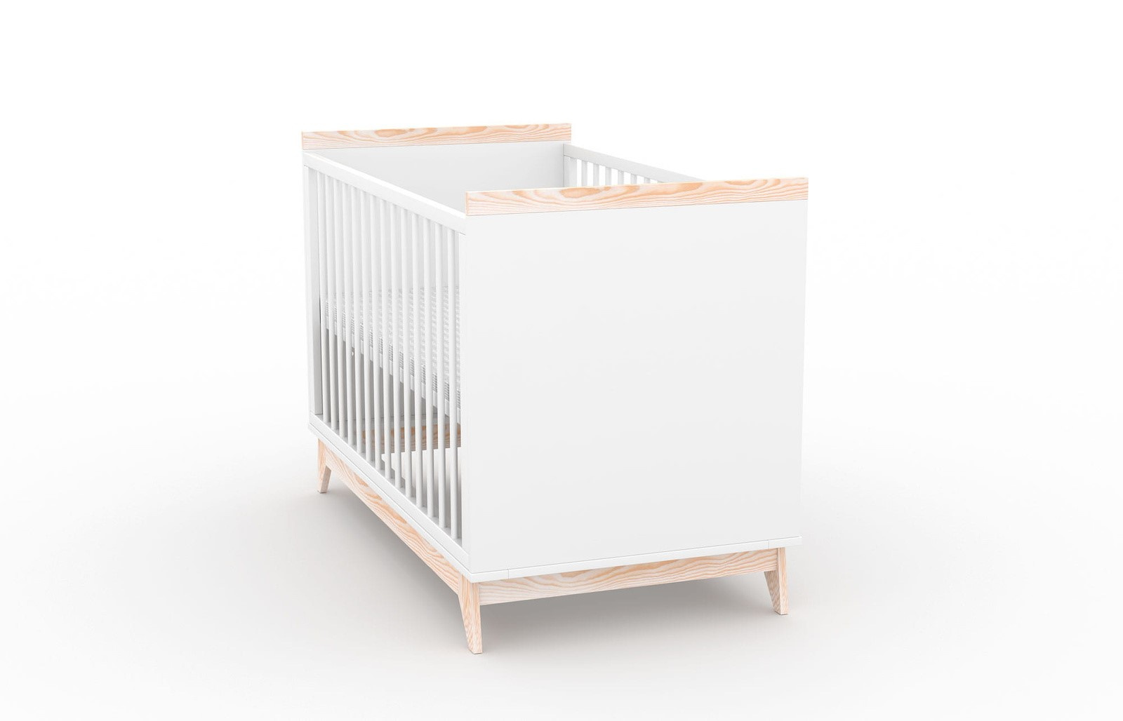 Łóżeczko niemowlęce Skrzat Vigo charakteryzuje się minimalistycznym designem, który wprowadza do pokoju dziecięcego jasne drewno i subtelne, geometryczne detale typowe dla skandynawskiego stylu. Jego prosta, a zarazem wyrafinowana konstrukcja sprawia, że łóżeczko Vigo wspaniale komponuje się z różnymi aranżacjami wnętrz, nadając im unikalny urok.