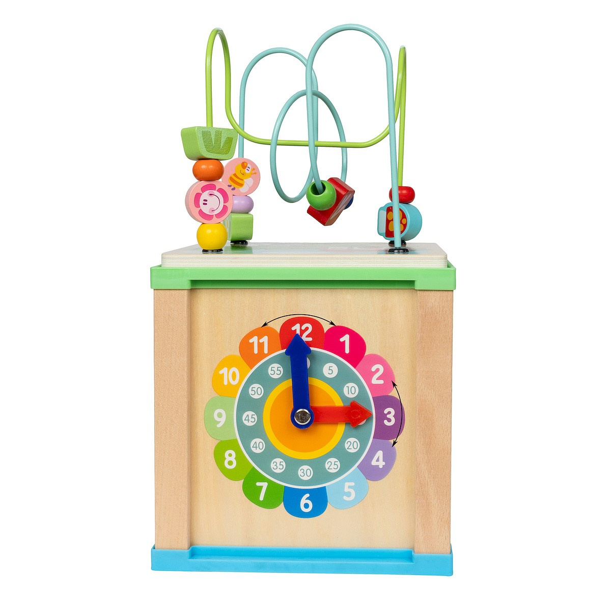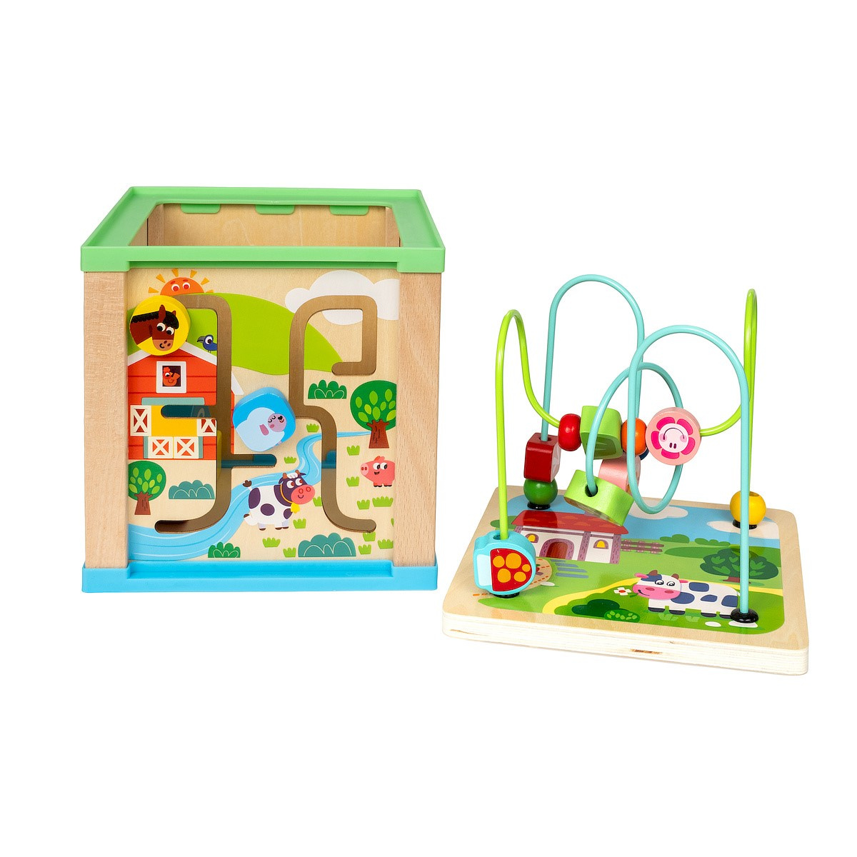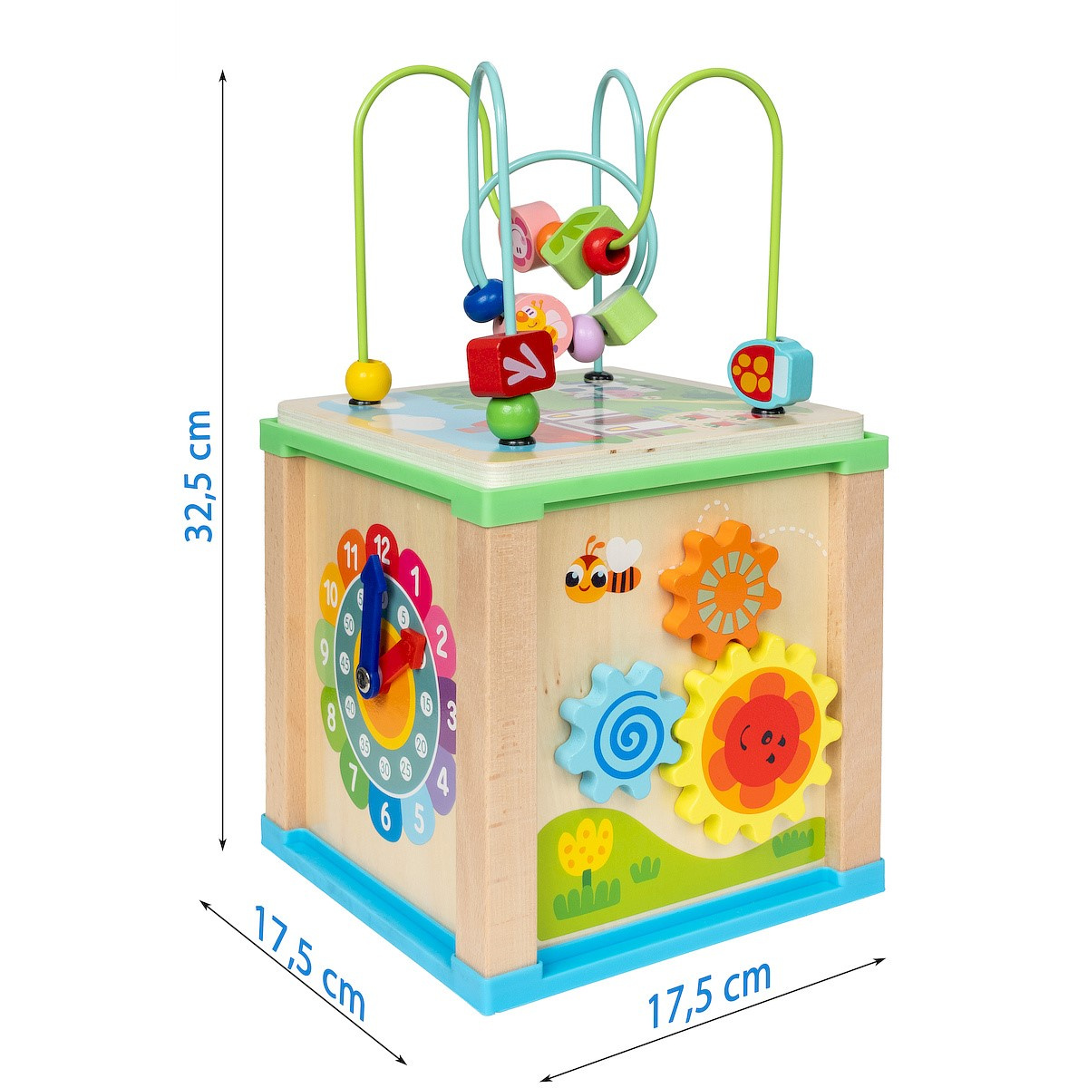 - Drewniana kostka aktywizująca wyposażona w kółka zębate, ścieżkę na farmie do pokonania, zegar do nauki godzin i minut, sorter dla rozwoju małych paluszków, przeplatanka, klocki z cyferkami.