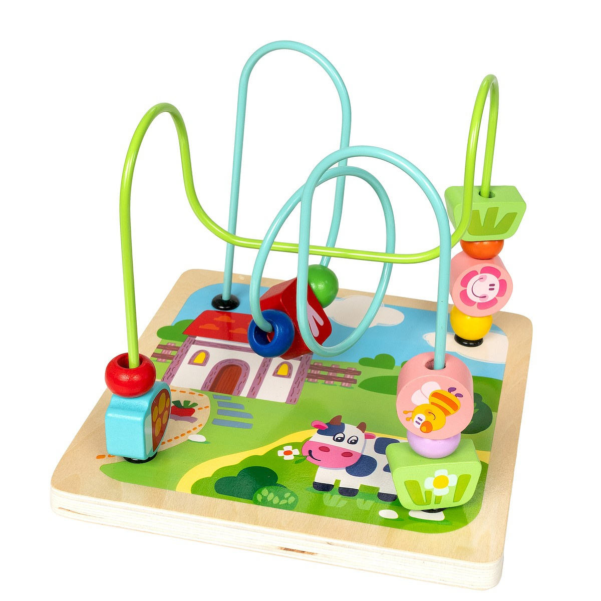 - Labirynt: Z jednej strony kostki znajduje się labirynt z przesuwanymi koralikami. Dzieci mogą przesuwać koraliki po zakręconych ścieżkach, co pomaga w rozwijaniu zdolności motorycznych oraz koordynacji ręka-oko.
