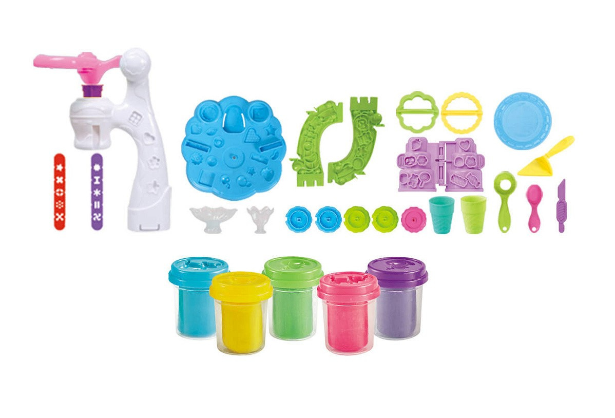 Kolorowa ciastolina w słoiczkach , 5 kolorów,oraz plastikowe akcesoria do złożenia maszyny do produkcji pysznych lodów.