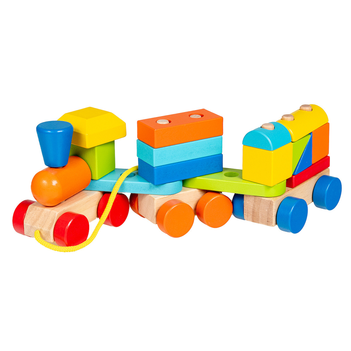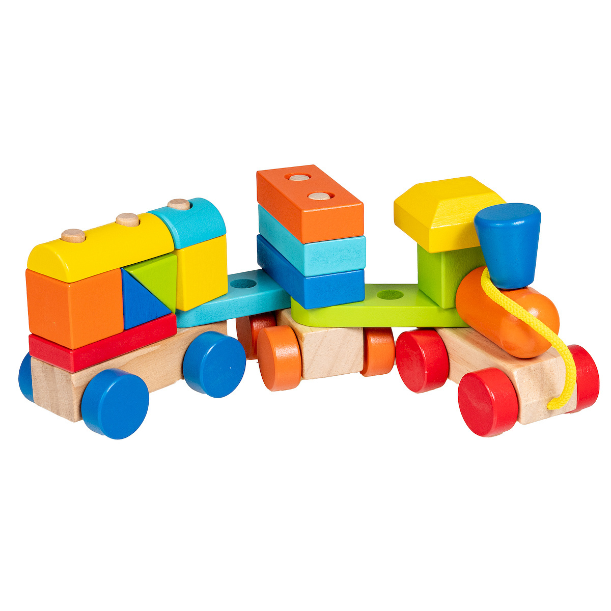 Pociąg z Klockami to zabawka do układania, budowania i ciągnięcia. Uczy rozpoznawania kształtów i kolorów.