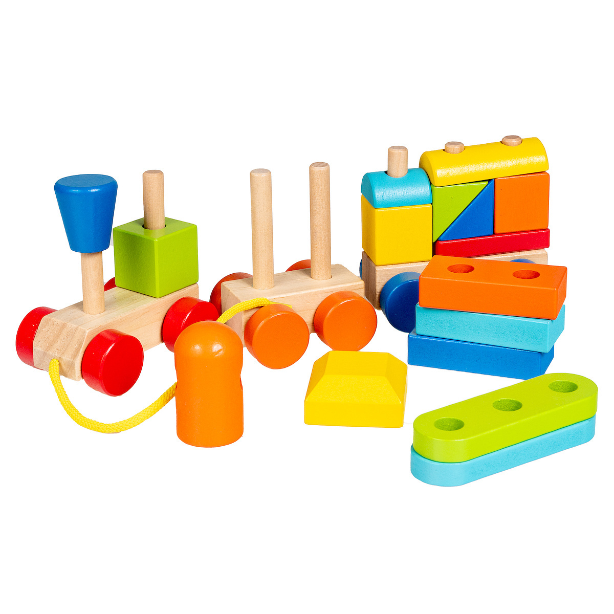 - Pociąg z Klockami to drewniana zabawka która rozwija sprawne rączki, koordynację wzrokowo-ruchową i wyobraźnię przestrzenną.