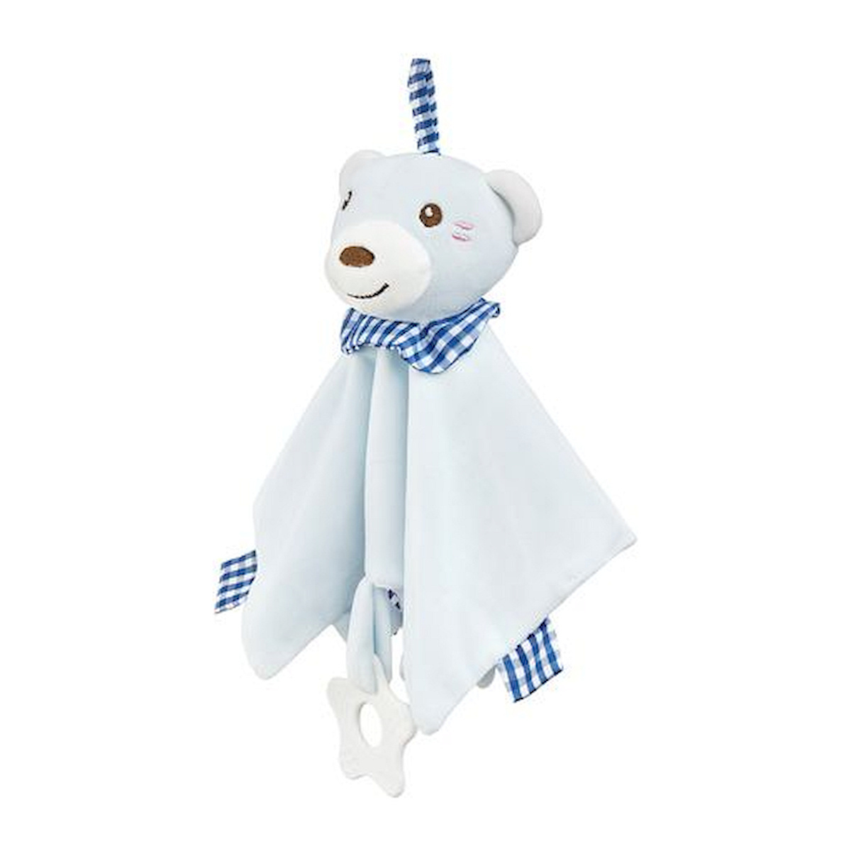 Miś pełni funkcję przytulanki, zabawki do gryzienia i pierwszych ćwiczeń chwytania. W główce maskotki znajduje się delikatna grzechotka.
