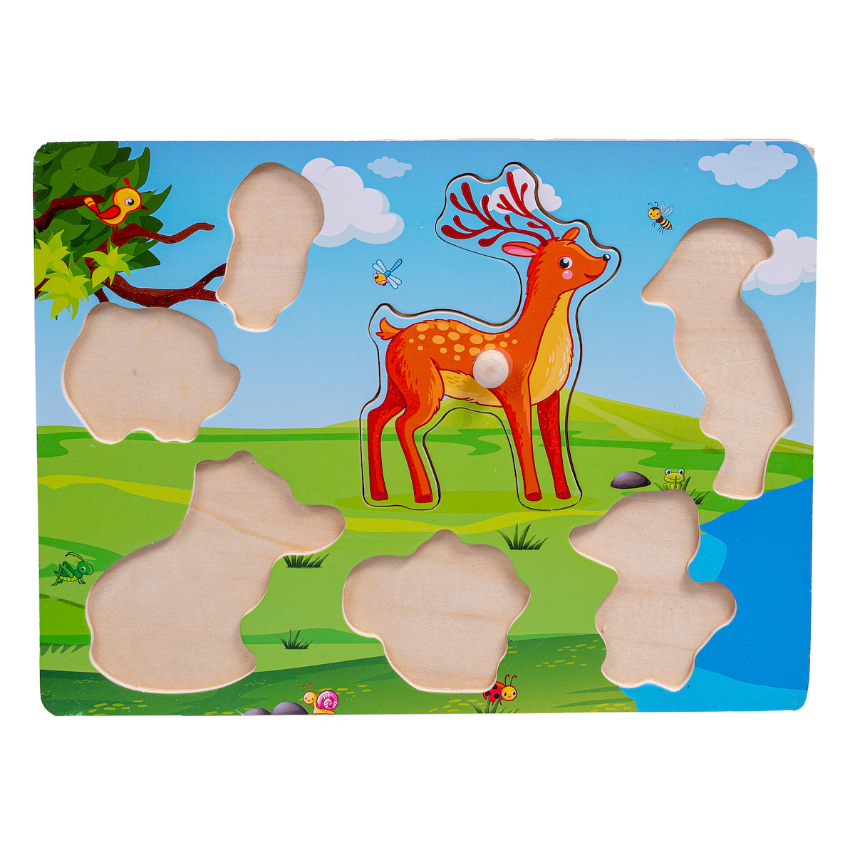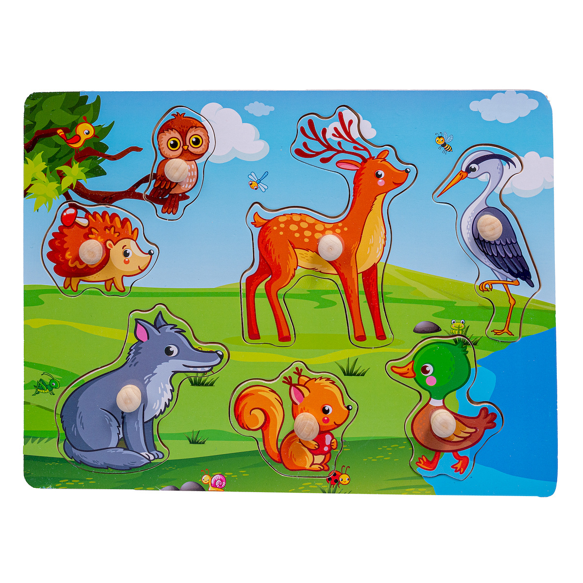 - Układanka drewniana z motywem zwierzątek leśnych, z wygodnymi uchwytami dla małych paluszków. Twój maluszek może poznawać zwierzęta podczas zabawy - układania.