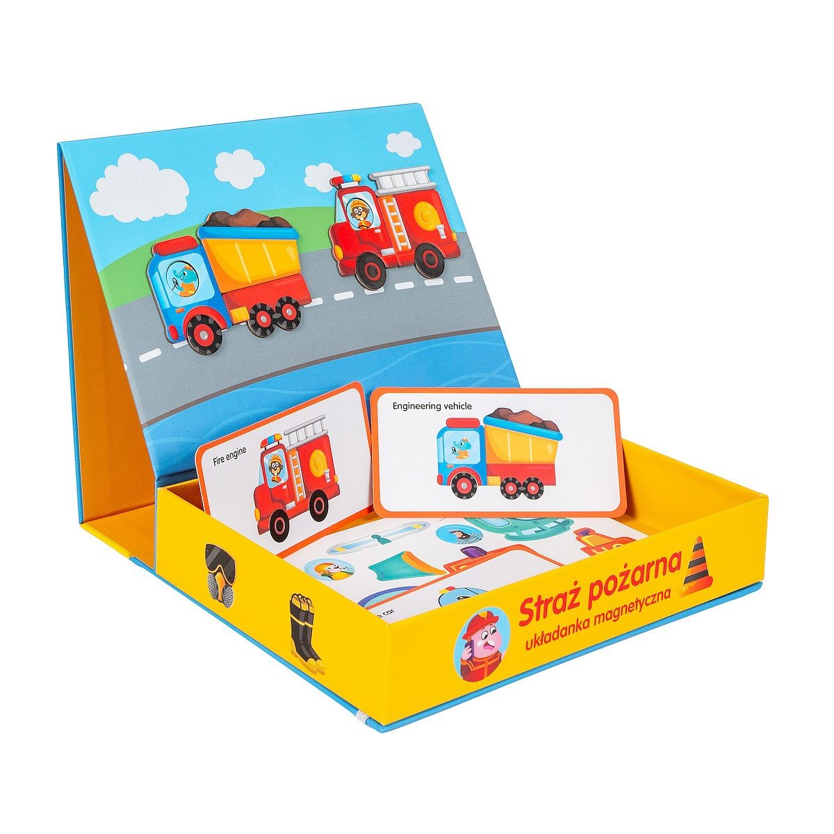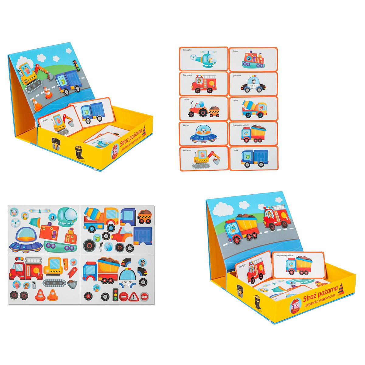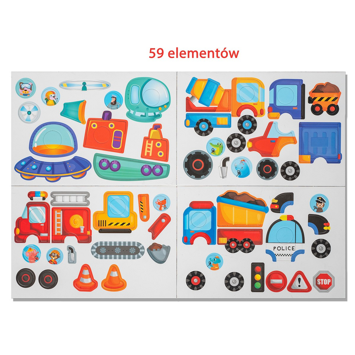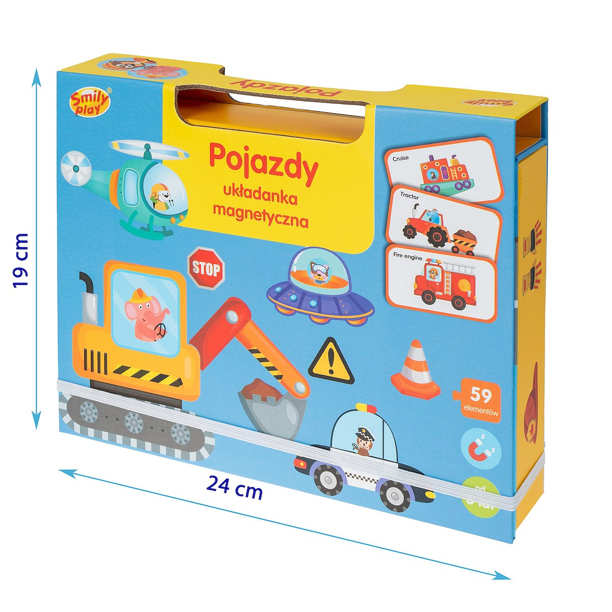 Zestaw zawiera 59 elementy/puzle z pojazdami, zapakowane do pudełka, w którym bezpiecznie i wygodnie dziecko przechowa magnetyczne obrazki.