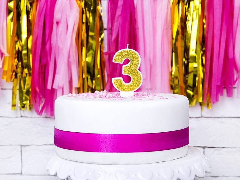 • Świeczka urodzinowa Cyferka 3 w kolorze złotym brokatowym, rozmiar ok. 7 cm.