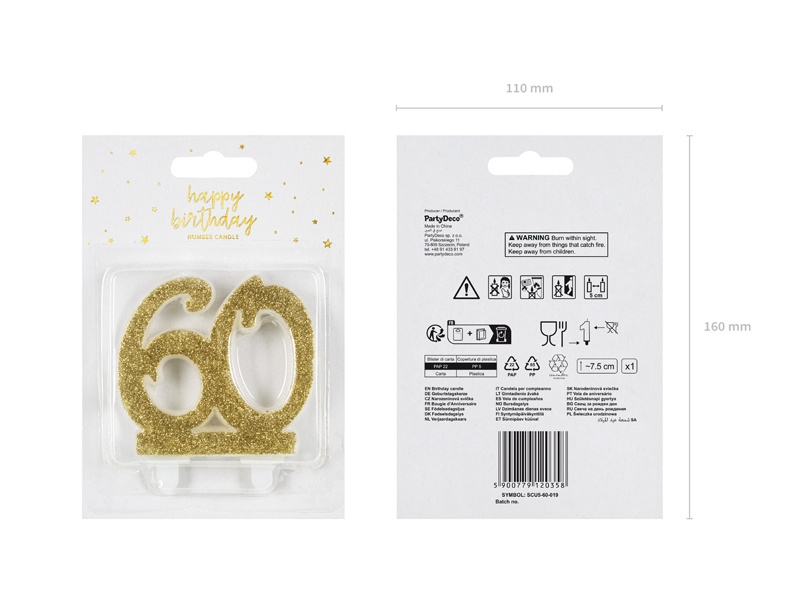 Świeczka urodzinowa liczba 60 w kolorze złotym brokatowym, rozmiar ok. 7.5 cm.