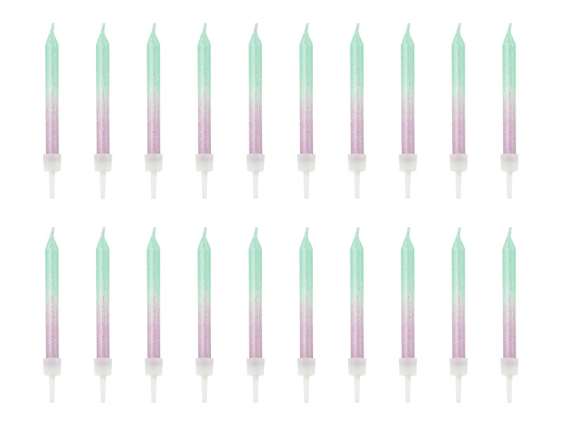 - Świeczki urodzinowe ombre, mix kolorów ( niebiesko - fioletowe), wysokość ok. 6 cm. Zestaw zawiera 20 świeczek i podstawek. (1 op. / 20 szt.)