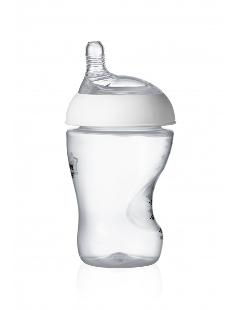 Nowa Ultra Butelka Tommee Tippee ma bardzo szeroki smoczek silikonowy zbliżony do kształtu piersi,ułatwiający dziecku ułożenie ust do ssania.