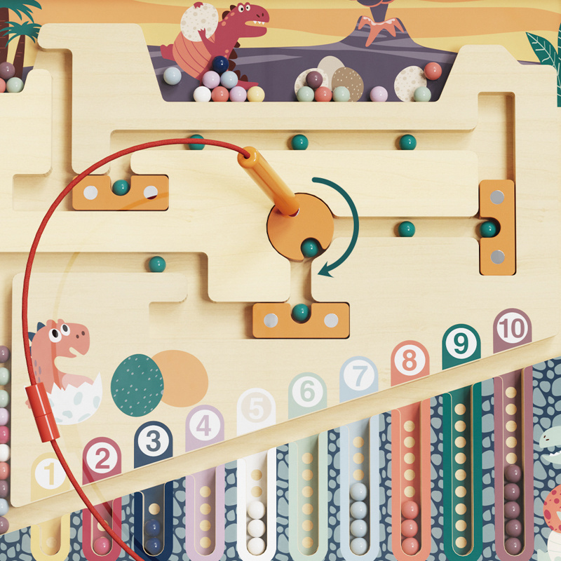 Za pomocą specjalnego, magnetycznego ołówka, dzieci przenoszą kolorowe jaja dinozaurów przez labirynt, aż do gniazd.