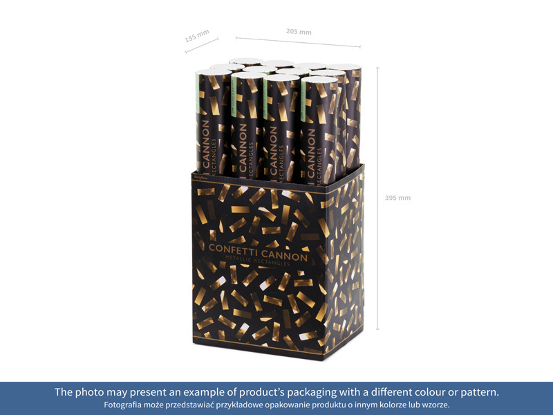 Tuba strzelająca metalicznym konfetti w kolorze złotym, długość 40 centymetrów.