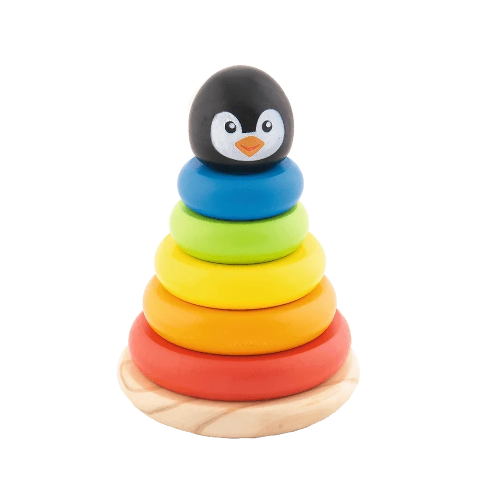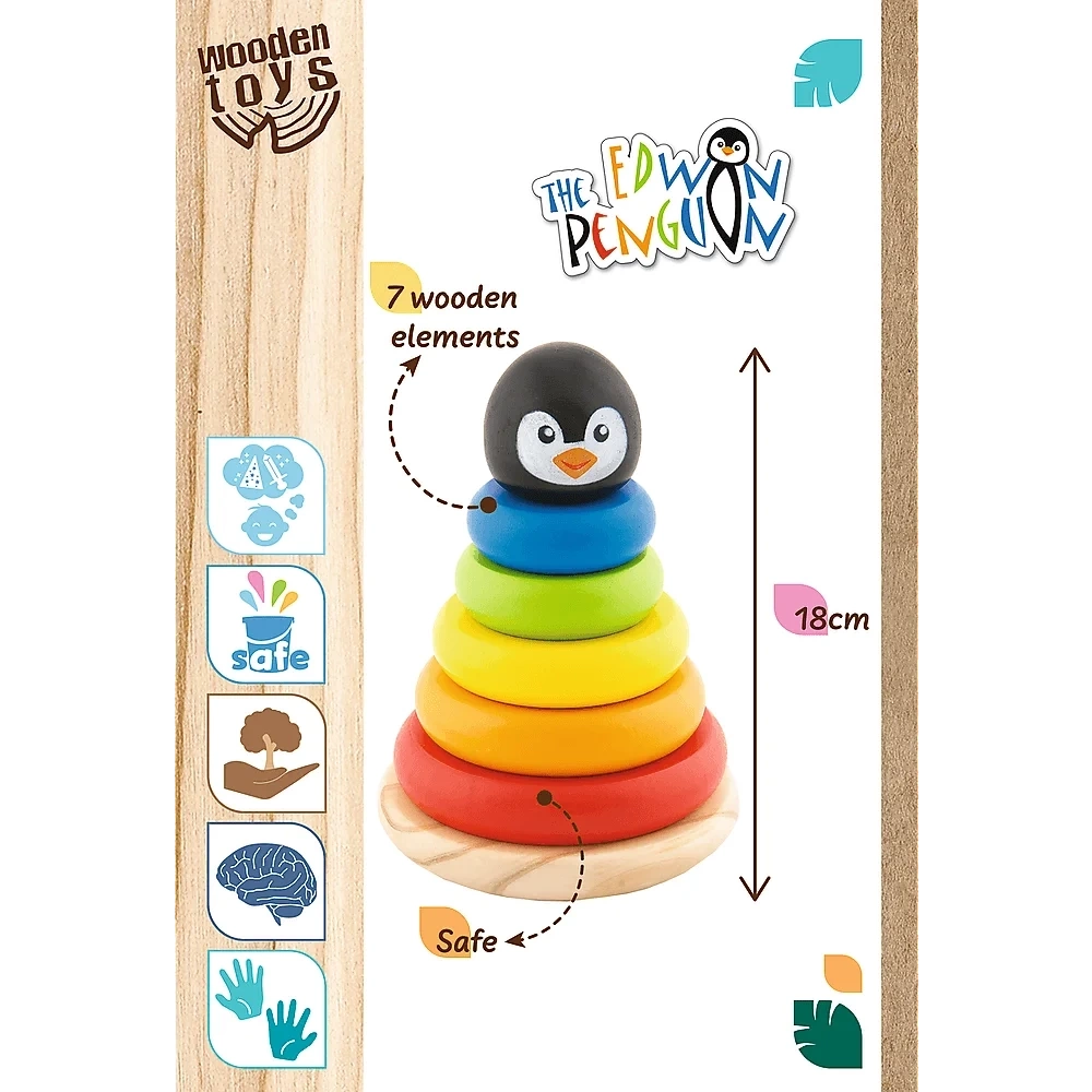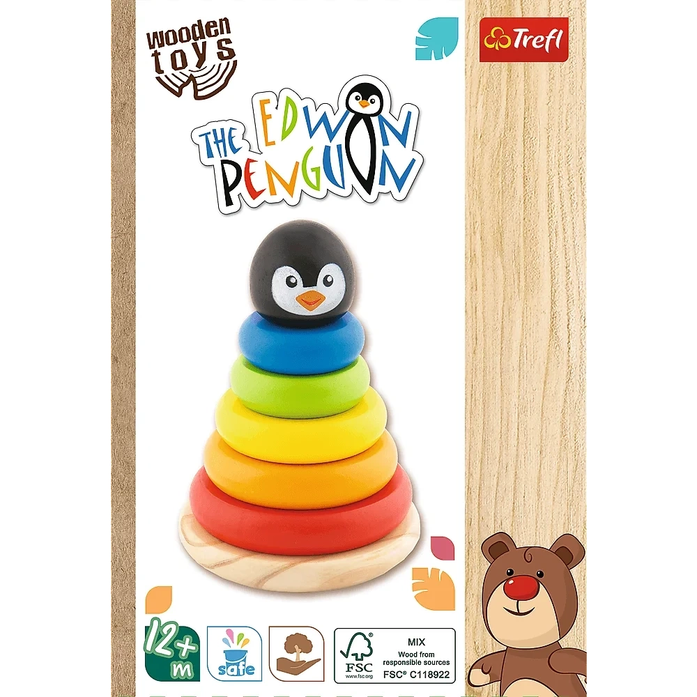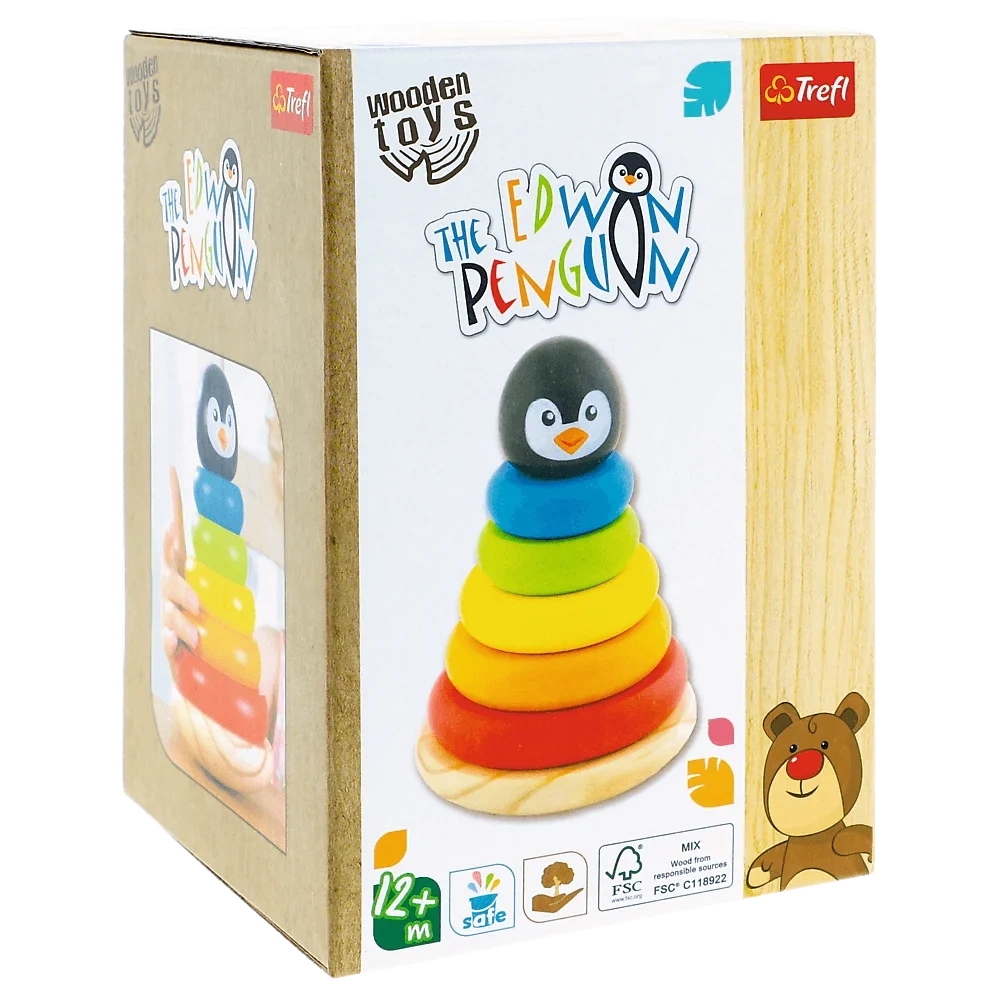 Pingwin Edwin to zabawka drewniana, która rozwija kreatywność, wspomaga naukę nazywania kolorów oraz ułatwia rozpoznawanie kształtów.
