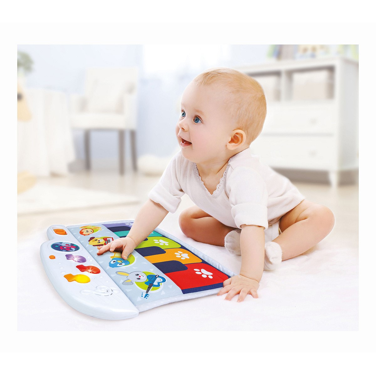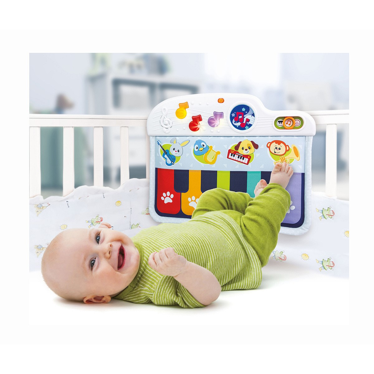 Może bawić się pianinkiem również poza swoim łóżeczkiem.