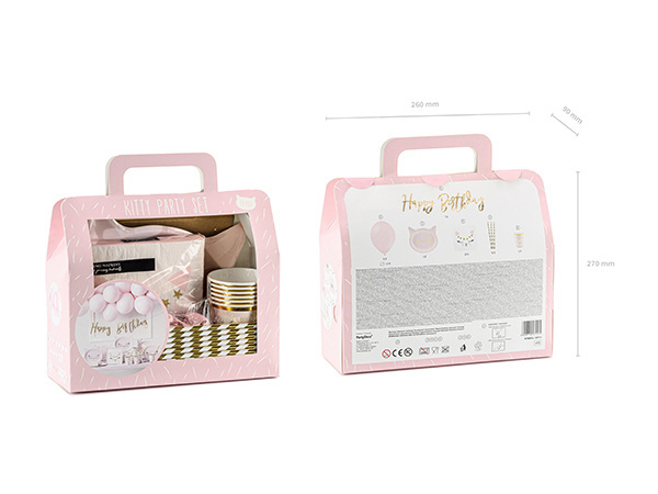 - Zestaw dekoracji party - Kotek, zestaw zawiera: baner Happy Birthday (1 szt.), kubeczki papierowe (6 szt.), talerzyki papierowe (6 szt.), słomki papierowe (10 szt.), serwetki papierowe (20 szt.) i balony lateksowe (blady róż, 12 szt.). Kubki na napoje zaw