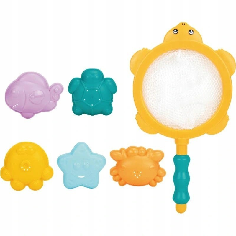 W zestawie znajduje się sitko do łowienia i 5 zwierzątek.