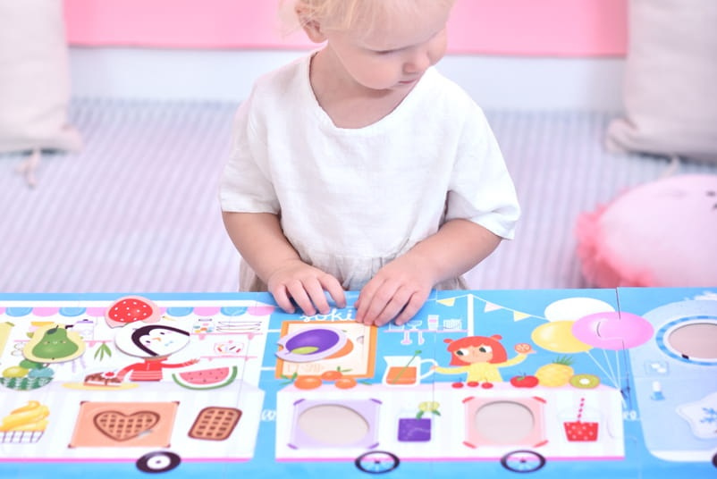 Następnie uzupełnijcie zapasy na półkach, dopasowując elementy o różnych kształtach do odpowiednich dziurek.