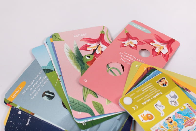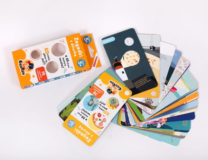 Aby zabawa była jeszcze bardziej ekscytująca, fragmenty ilustrowanych odpowiedzi są widoczne przez specjalne dziurki.
