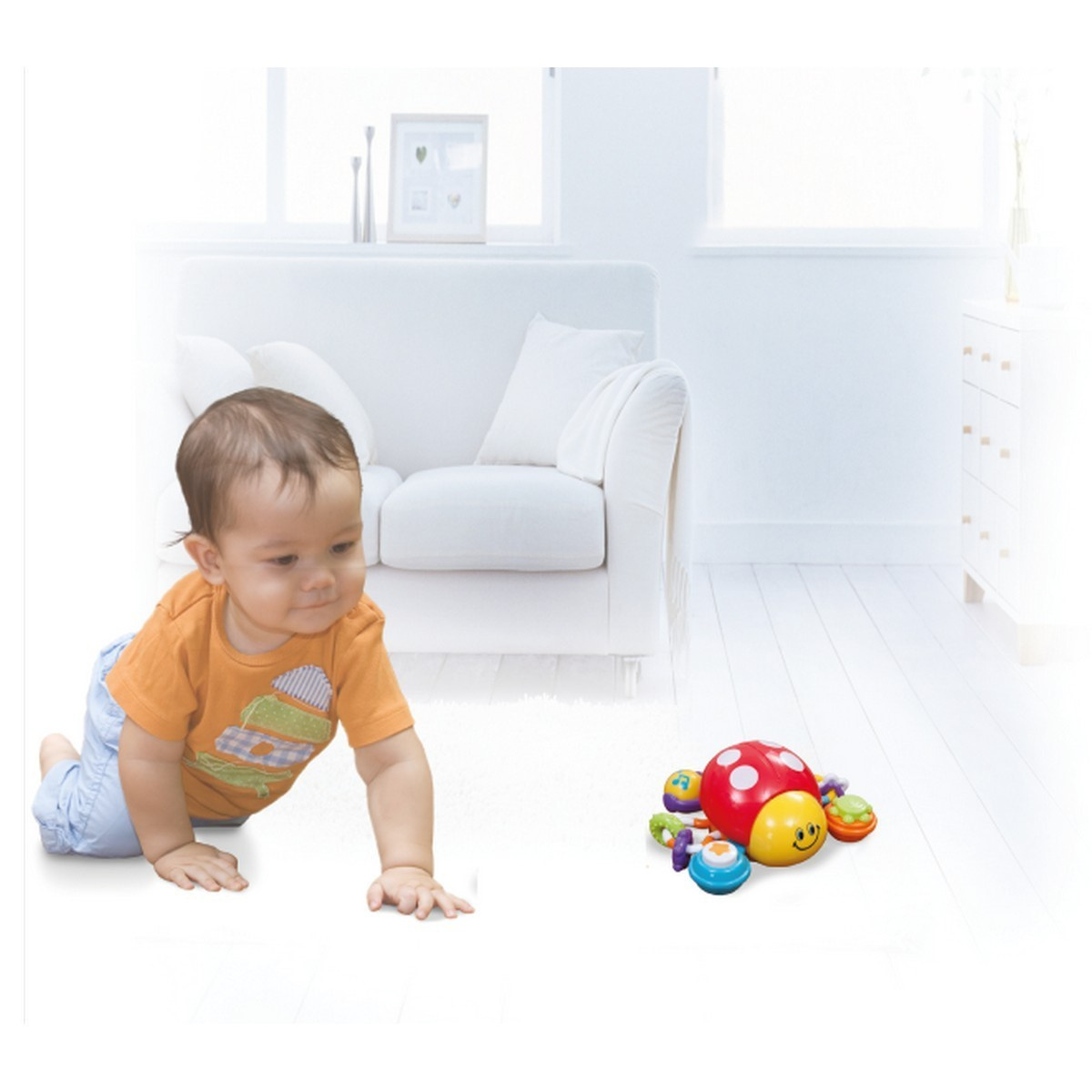 Każda z 6 nóg biedronki posiada inną zabawkę, dzięki czemu rozwija także zdolności manualne, słuchowe i poznawcze dziecka.