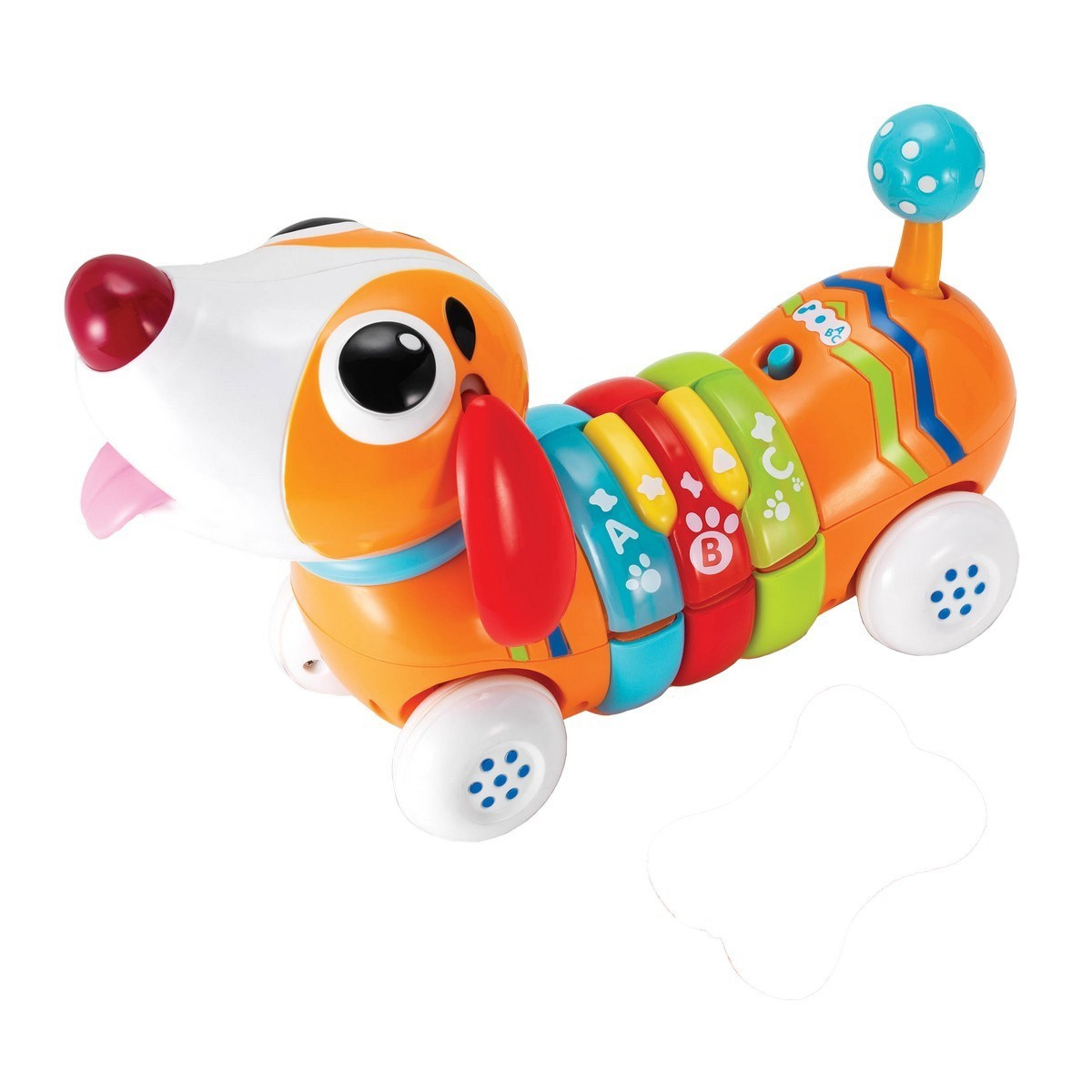 - Aktywizuje zmysł dotyku: korpus pieska, jego ogonek, przyciski mają różne faktury.